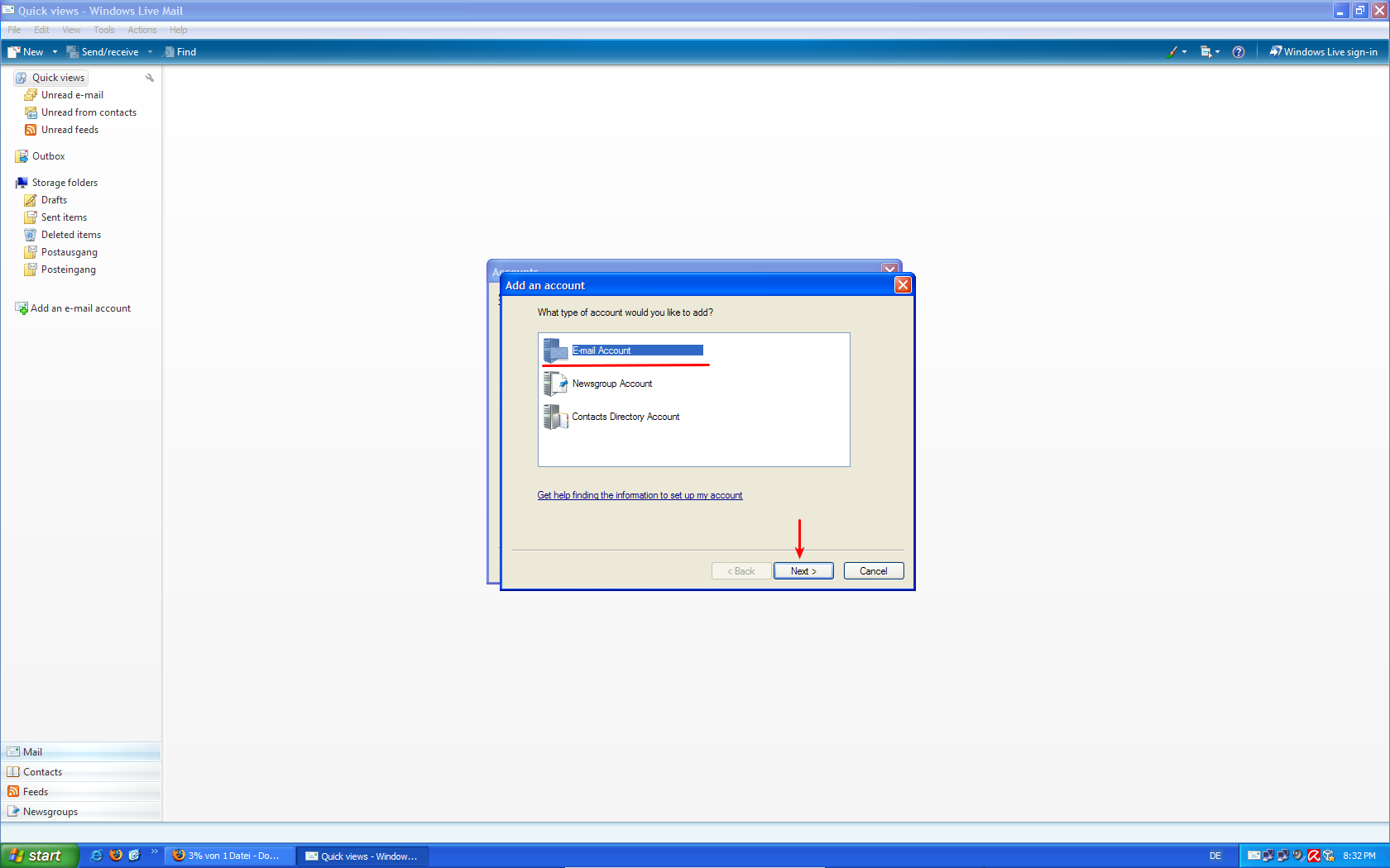 E-mail account და დააკლიკეთ ღილაკს Next.