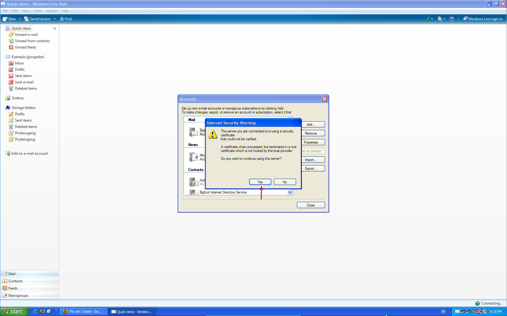 7. ახალ ფანჯარაში დაადასტურეთ მეილ-სერვერის სერტიფიკატის სანდოობა